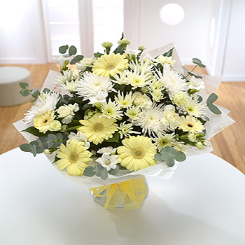Subtle tones of white and cream Germini, Freesia, Carnations and Chrysanthemums with the muted beauty of an Opal.