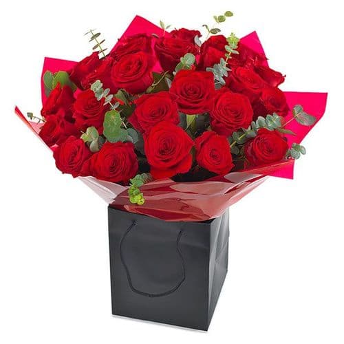 A beautifully romantic bouquet of two dozen red Roses. Impeccably presented and ready to display.