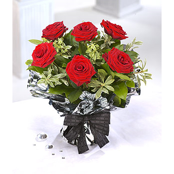 Simply gorgeous. An aqua pack of 6 perfect large lush luxury velvety red roses surrounded by plump green foliage.