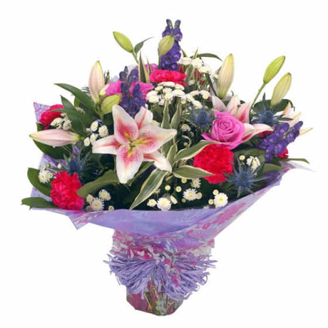 A gloriously colourful hand-tied bouquet containing mixed flowers in bright colours including Lilies, Roses, Carnations and Chrysanthemums. Presented in an aquapack for instant display and finished with complementary packaging.