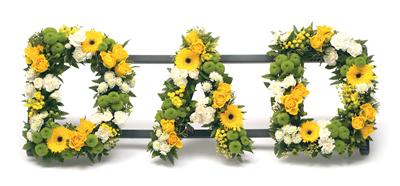 Loose based letters on stand, including Roses, Gerberas, Chrysanthemums and complementary foliage edge. Size: Height - 28cm (11") Length - 80cm (31").