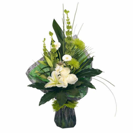 An unusual hand-tied upright bouquet with cream Lilies, cream Roses, cream Mini Gerbera complemented by vibrant green Chrysanthemums and foliage. Beautifully packaged and presented in an aquapack for instant display.