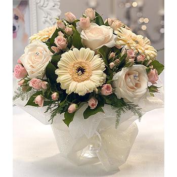 A very pretty and delicate aqua packed flower arrangement featuring the soft, subtle shades of pink spray Roses, cream Roses, Germini and Asparagus Ferns. An ideal floral centre piece for the Jubilee celebration.