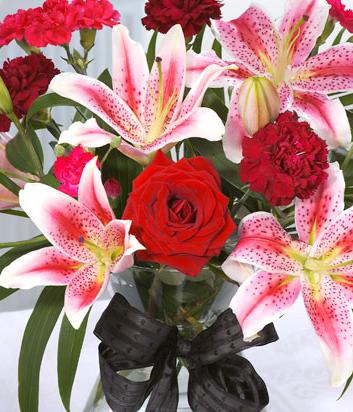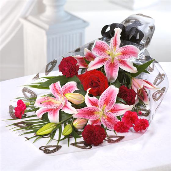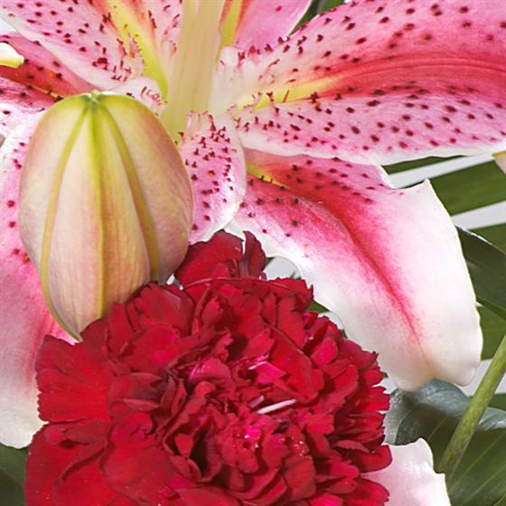 Striking pink Lilies, mixed with deep red Roses and Carnations. A generous bouquet to show your love.