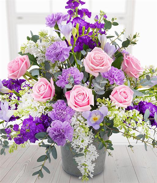 An enchanting flower display exquisitely presented, featuring pink Roses, white Lilacs, purple Stocks with lilac Carnations and delicately fragrant Freesias.