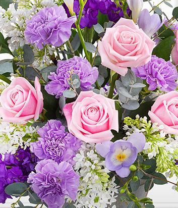 Includes Pink Rose, White Lilac, Lilac Freesia, Purple Stock, Lilac Carnation, Eucalyptus, Hard Ruscus.