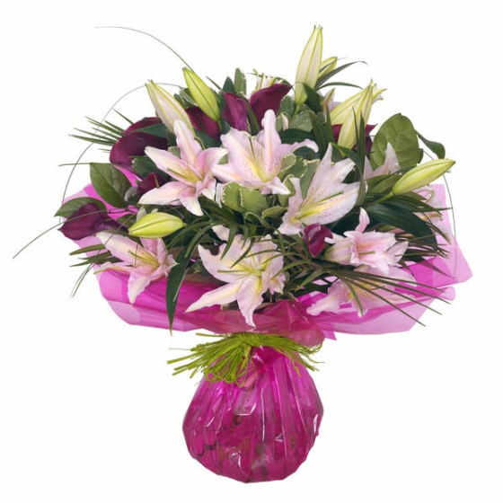 A stunning deep pink and light pink hand-tied flower bouquet with Oriental Lilies, a touch of deep pink and rich green foliage. The bouquet comes beautifully packaged in an aquapack for instant display.