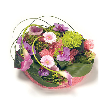 A contemporary loose posy arrangement in delicate shades of pink & purple Gerbera & Orchids with a splash of lime green Chrysanthemums and complementary foliage, wrapped in an abaca ribbon and finished with bear grass twists. Size: 36cm (14").