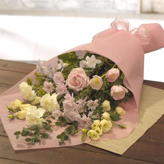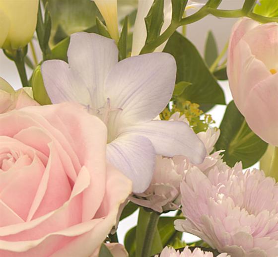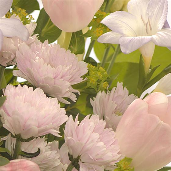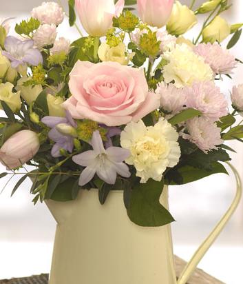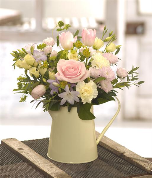 A delicate soft shades bouquet of Tulips, fragrant Freesia, Carnations and a soft pink Rose. Jug not included.