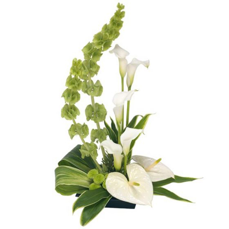 A modern tall container arrangement featuring white Calla Lilies, white Anthurium and Chrysanthemums. Flowers are arranged in floral foam for long lasting freshness and easy display