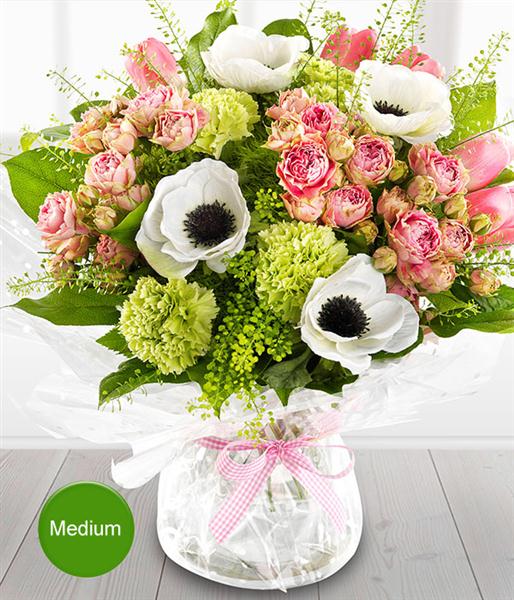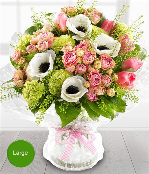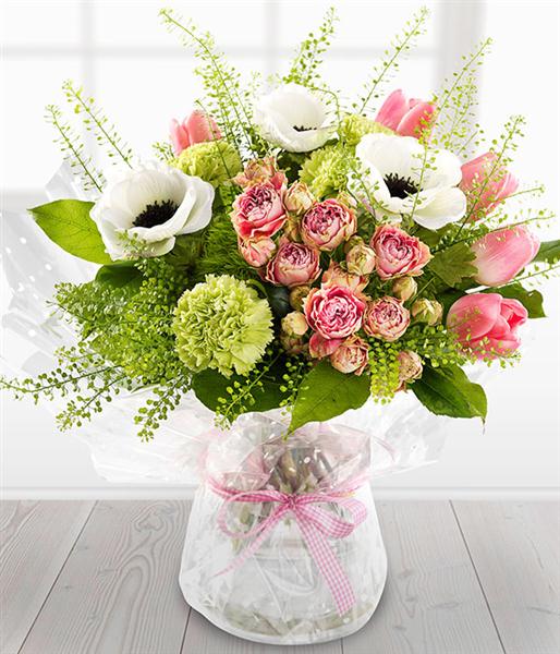 A pretty pink and white spring flower Bouquet featuring Roses, Anemone, Sweet William, Tulips and Carnations.