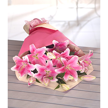 A beautifully presented fragrant wrap of pink lilies. Simply stunning.