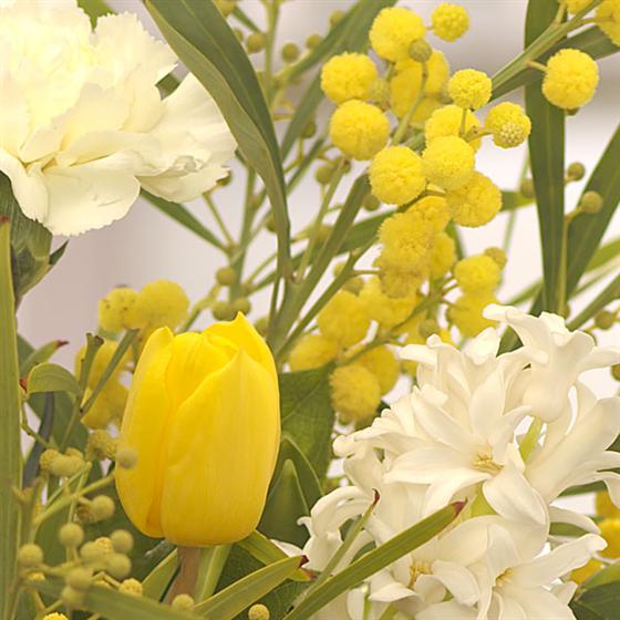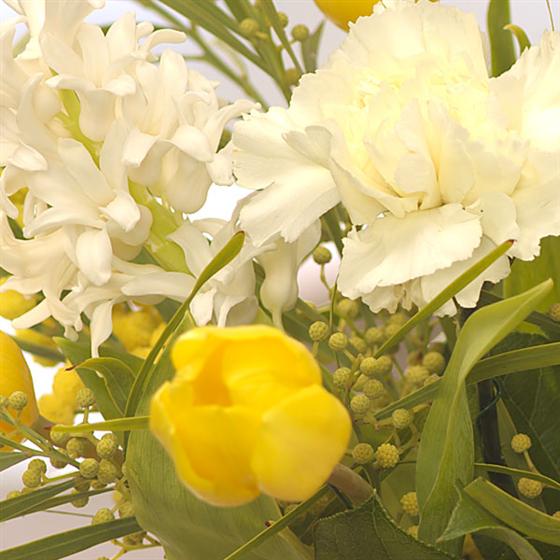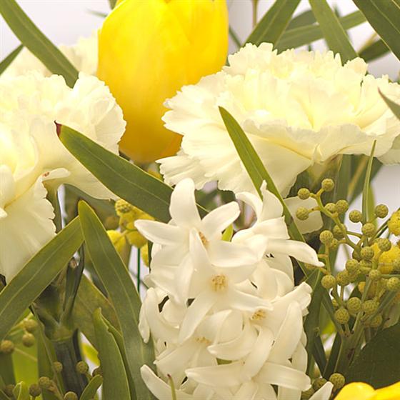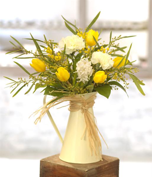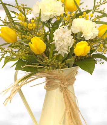 A fabulously fragrant cream jug of Spring flowers including long lasting Carnations, yellow Tulips, scented Hyacinth and Mimosa.