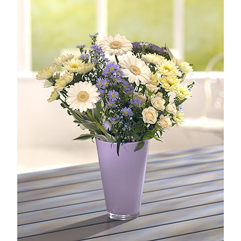 The lemon, cream, white and blue hues of these roses, asters and chrysanthemums combine to form a very pretty vase arrangement.