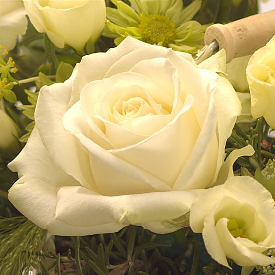 A beautifully cool summer colour combination of Roses, Lisianthus, Ammi and foliage, presented in a lovely cream flower bucket.