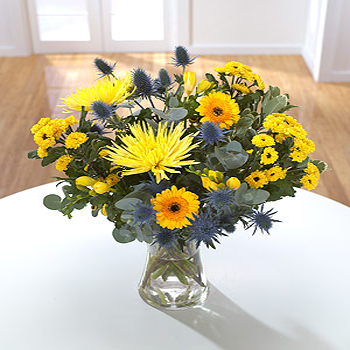 Yellow Chrysanthemums fight for the lead with Germini and scented Freesia. The bold blue Eryngium contrasts beautifully with the yellow flowers in this bouquet.