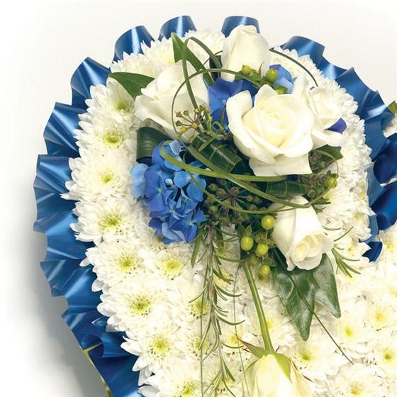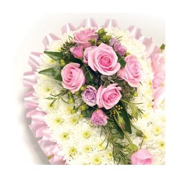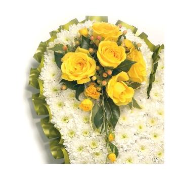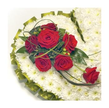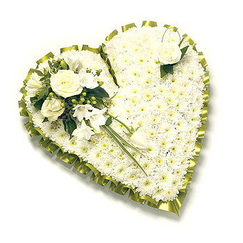 Classic white Chrysanthemum based heart shaped tribute with Roses, Freesia & Hypericum and complementary foliage edge. Size: Height - (15") Length - (15").