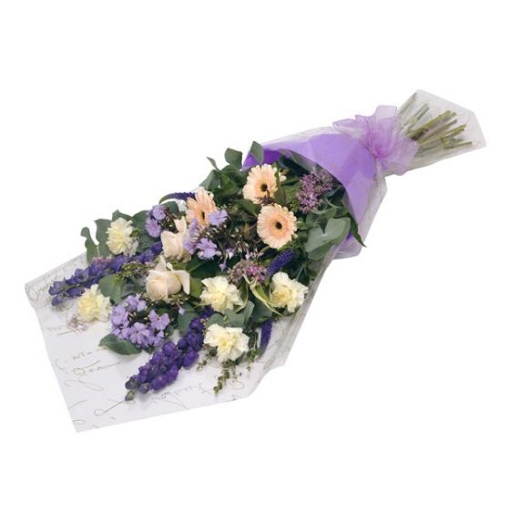 A traditional bouquet of purple and cream flowers Carnations, Mini Gerbera, roses, Phlox and Veronica packaged for easy arrangement at home.