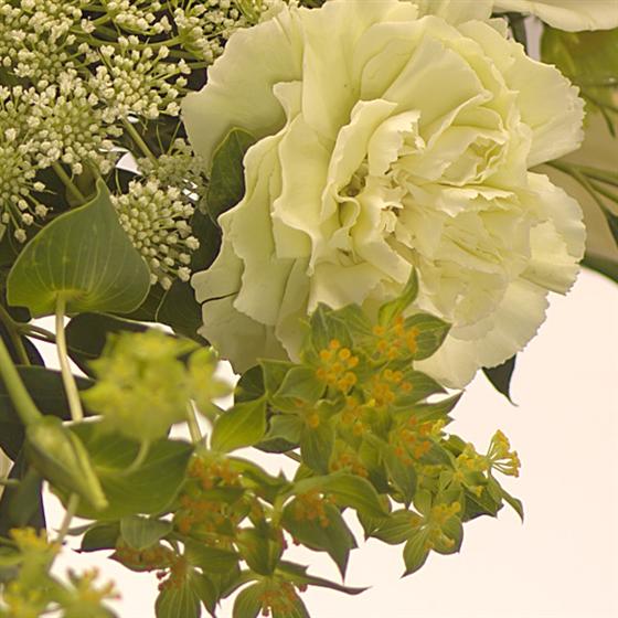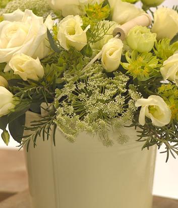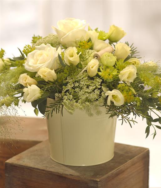 A beautifully cool colour combination of Roses, Lisianthus, Chrysanthemums and foliage, presented in a lovely cream flower bucket.